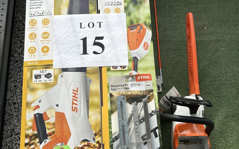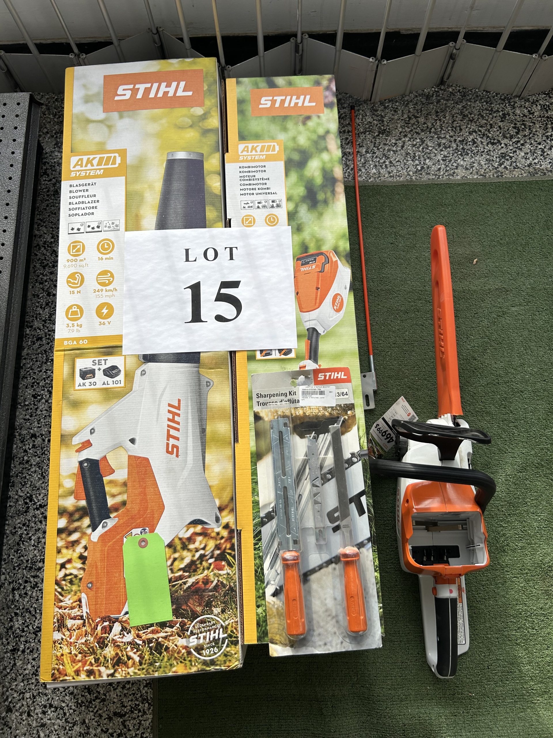Item Lot 15- Ensemble a batterie STihl , scie a chaine MSA 120C , moteur sans accessoire KMA 80R , souffleur a feuille BGA60 avec 1 batterie et 1 chargeur