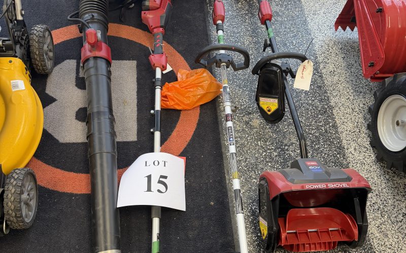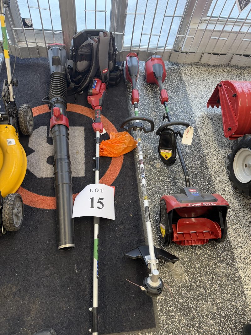 Lot 15- Ensemble Toro a batterie , souffleur a feuille dorsal, coupe branche et bordure , pelle a neige