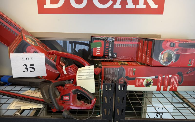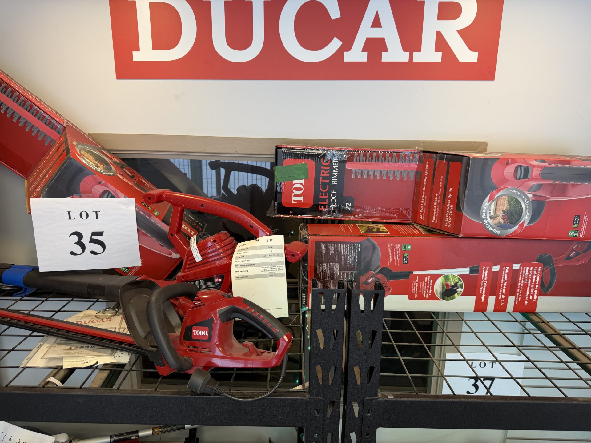 Item Lot 35- Ensemble Toro électrique , souffleur a feuille , coupe bordure , 3 taille haies 5 mcx