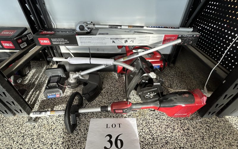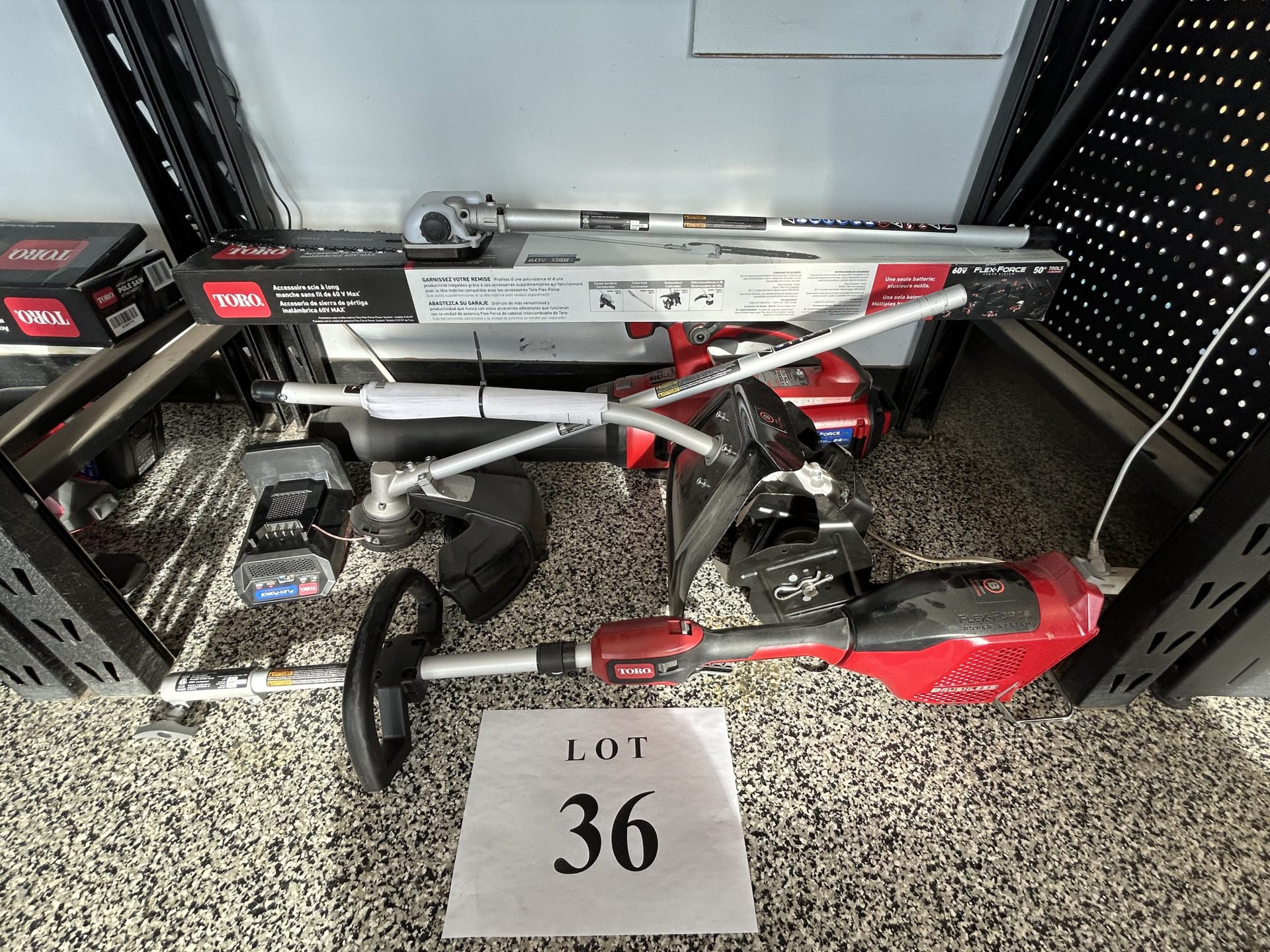 Marque Lot 36- ensemble TORO coupe bordure , (2) coupe branche , rotoculteur , souffleur a feuille avec 1 batterie et 1 chargeur